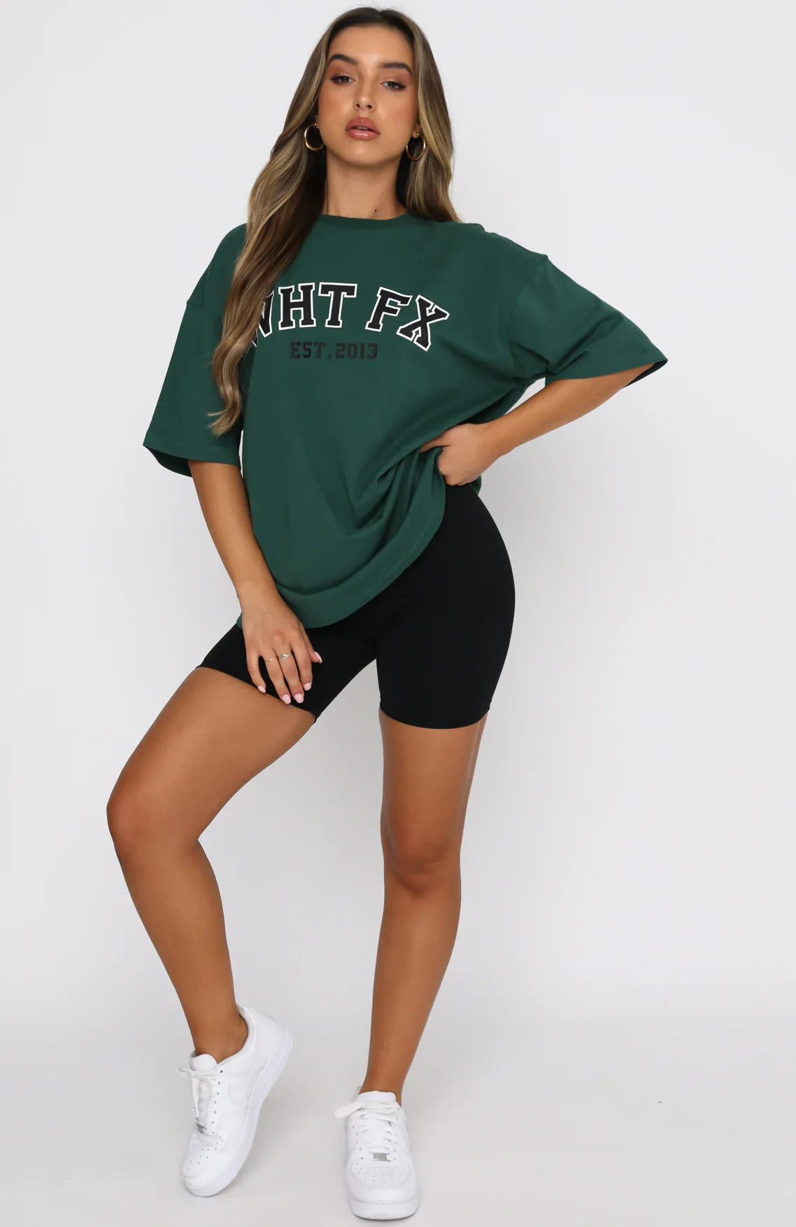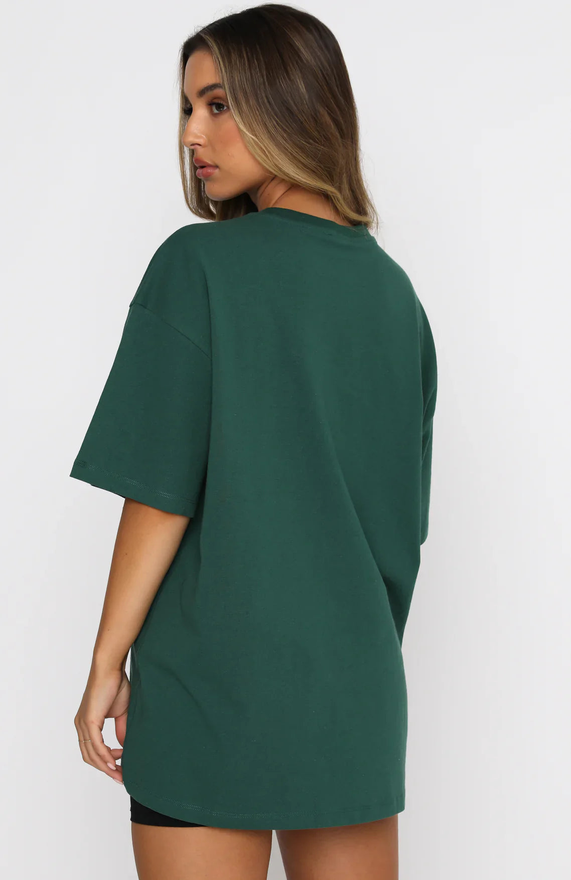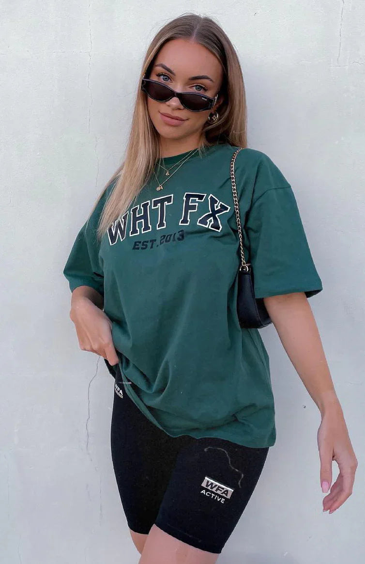Style meets comfort in our Varsity Tee in Green. This oversized top has a high scooped neckline, slouch shoulders, and printed graphic centre front. Complete the look with bike shorts and sneakers for a seriously stylish outfit.