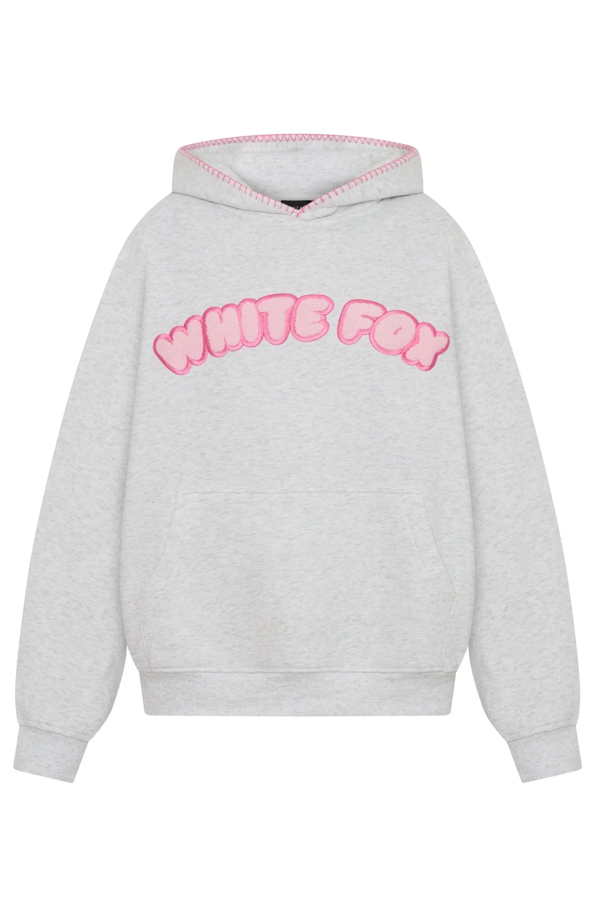 Unwind in style. The Vol. 1 Front Graphic Oversized Hoodie Grey Marle features a relaxed double-lined hood with exposed stitching, slouched shoulders and ribbed hems, which round out an oversized silhouette. Featuring long sleeves, a roomy front pocket, and an unlined fleece interior, this hoodie delivers a cosy feel. White Fox borg text embellishes the centre front, paired with a printed "made with love" text side back. Style with your go-to denim jeans and layered gold jewellery for a chill weekend fit.
