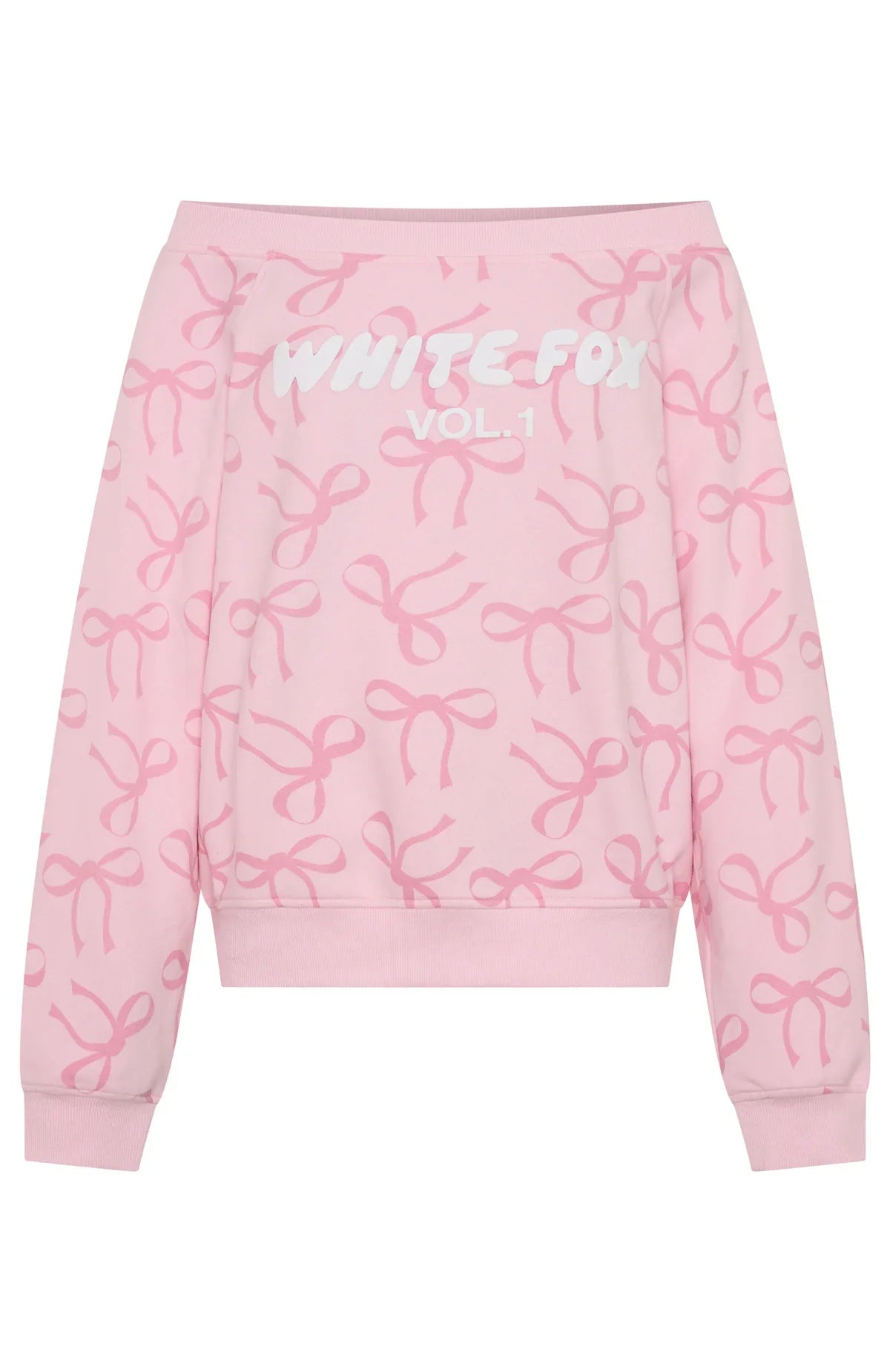 Unwind in style with our prettiest loungewear yet. The Vol. 1 Off Shoulder Printed Sweater in Posy Bow is designed with an off-the-shoulder neckline and ribbed hems, which round out an oversized silhouette. Featuring long sleeves and an unlined fleece interior, this hoodie delivers a cosy feel. White Fox puff print text embellishes the centre front. Style with your go-to denim jeans and colour sneakers for the cutest fit!