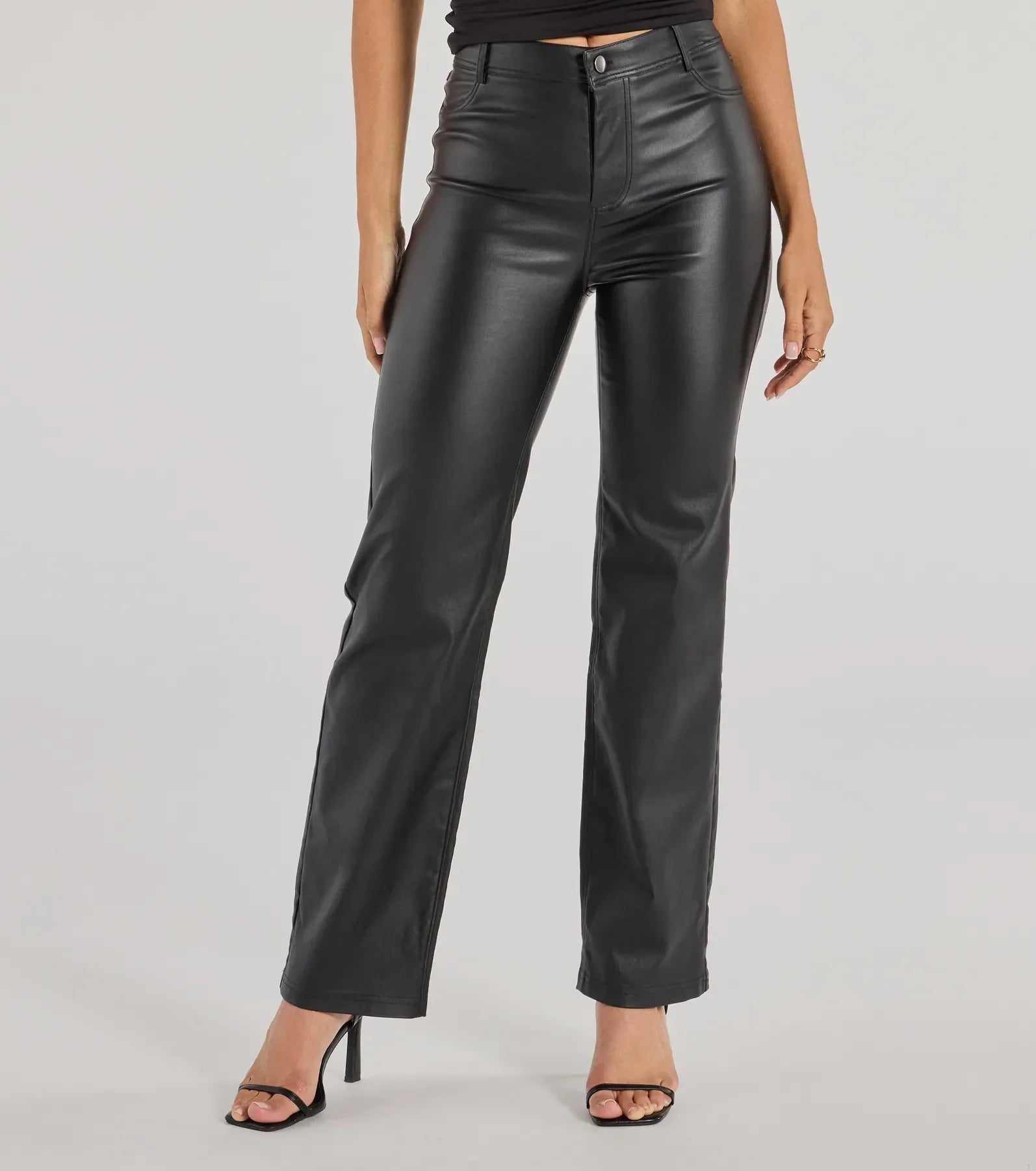 In these faux leather pants, you'll be walking the walk of cool-effortless style! They feature a flattering high-rise waist and straight-leg silhouette on coated faux leather fabric that offers a sleek look for workwear or everyday 'fits. Complete the look in a and block heels.