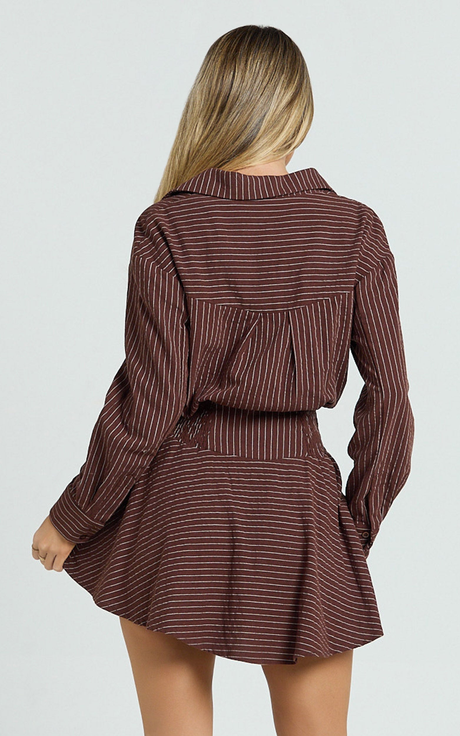 With a collared neckline, button-through front and waist-defining silhouette, it gives crisp shirting energy in an easy mini length, perfect for desk-to-dinner and everything after. The subtle stripe elongates, the long sleeves balance the hem, and the neutral brown tone slots seamlessly into your rotation.