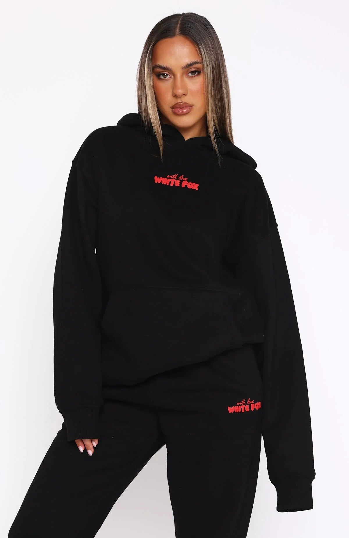 The With Love Always Oversized Hoodie Black is an oversized fit and features elasticated ribbed cuffs & hem, hood, soft fleeced fabric for extra comfort and a puff print logo front side and centre back. Bundle up and complete the set with the matching With Love In The Moment Sweatpants Black for a look worthy of your night in.