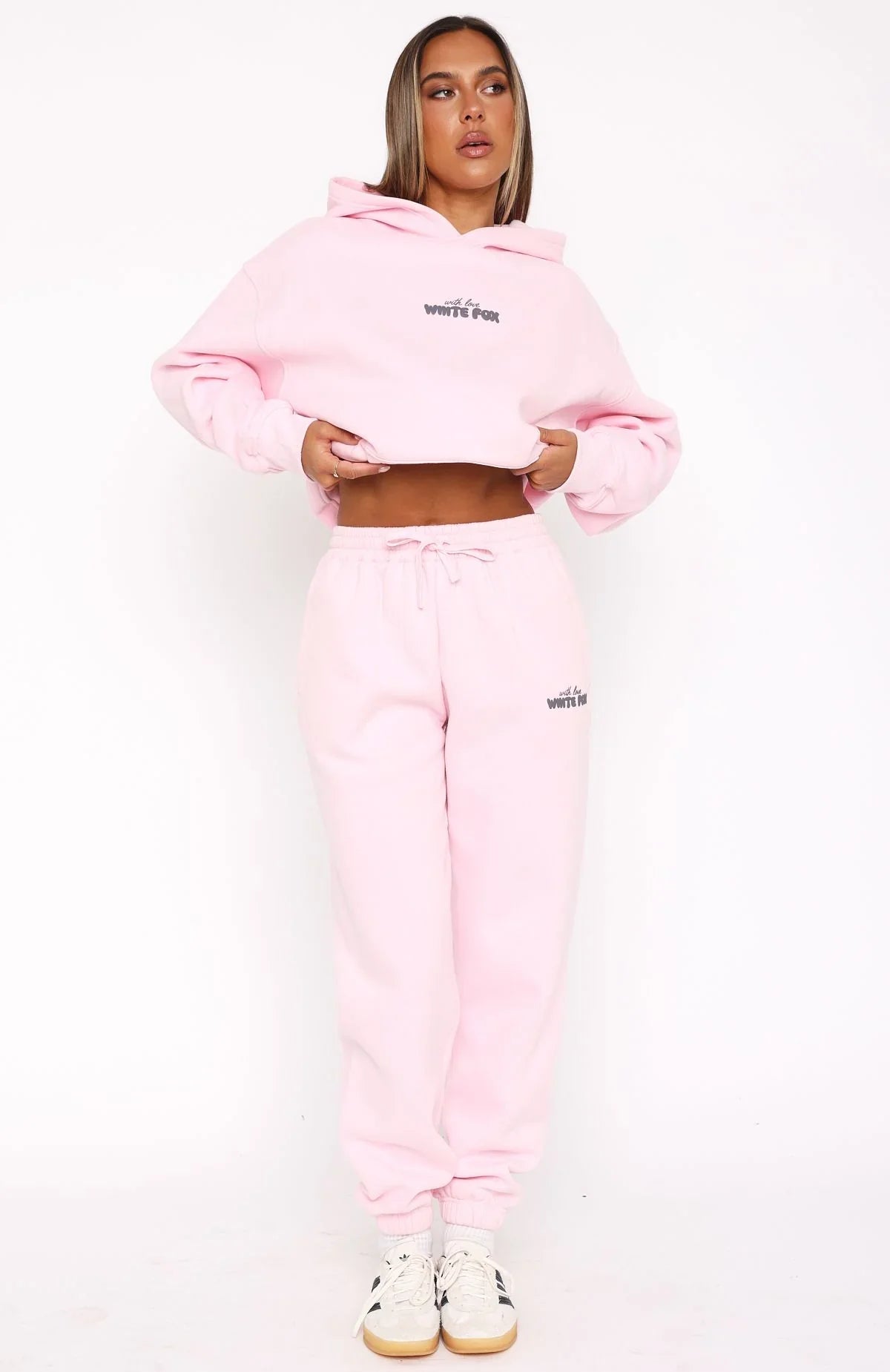 Fall in love with comfy in the With Love In The Moment Sweatpants Pink. Features a high elasticated drawstring waistband, elasticated ankles, side pockets, soft fleece fabric for extra comfort and printed logo on side of leg. You can complete the tracksuit with the matching With Love In The Moment Oversized Hoodie Pink for the perfect off-duty look.